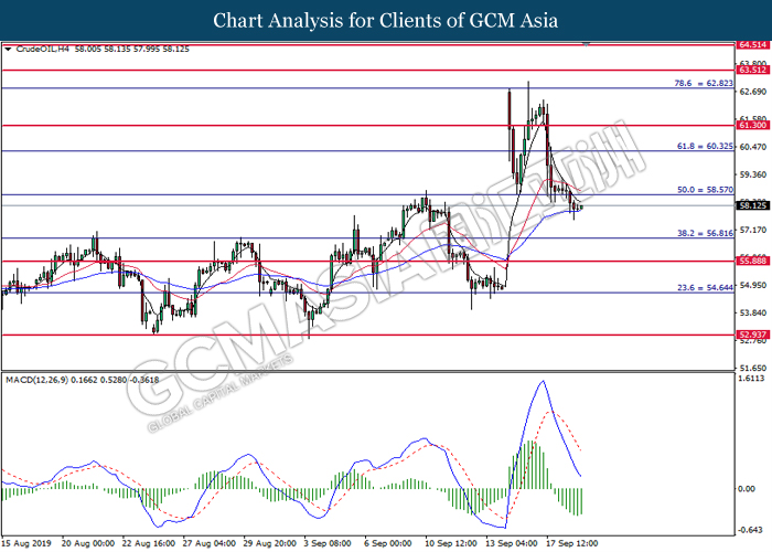 Bagi pasaran komoditi, harga minyak mentah susut sebanyak 0.12% ke $58.19 setong. Niaga hadapan minyak mengalami penjualan yang ketara selepas Energy Information Administration melaporkan peningkatan pada stok minyak bagi minggu lepas sebanyak 1.058 juta tong, tersasar daripada ramalan untuk menurun sebanyak -2.496 juta tong. Selain itu, harga emas susut sebanyak 0.05% ke $1,493.30 se troy auns berikutan dengan nada hawkish Fed yang telah menukar sentimen pasaran untuk beralih kepada aset berisiko.