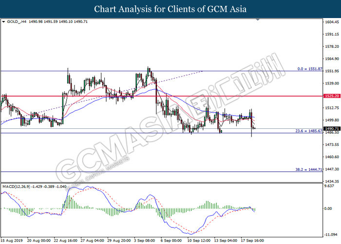 GOLD_, H4: Harga emas telah didagang dengan lebih rendah selepas ia berundur dari paras tinggi. MACD yang memaparkan momentum bearish mencadangkan komoditi ini untuk melanjutkan kerugiannya dan menuju ke arah tahap sokongan 1485.65.