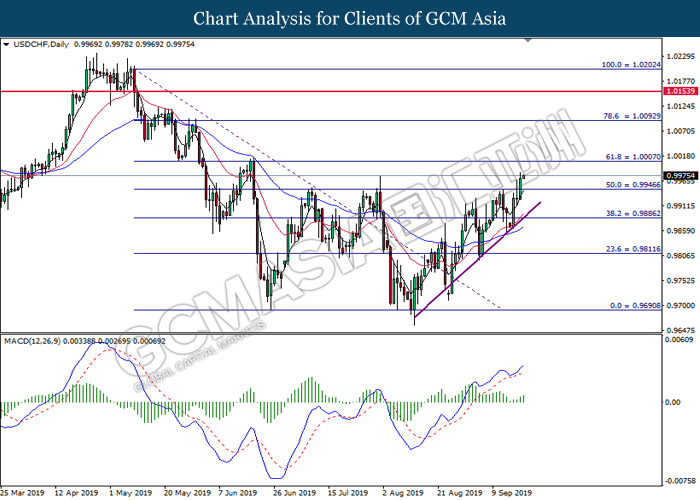 USDCHF, Daily: USDCHF telah didagang dengan lebih rendah selepas ia memecah tahap rintangan sebelumnya 0.9945. MACD yang memaparkan momentum menaik mencadangkan pasangan ini untuk melanjutkan keuntungannya ke arah tahap rintangan 1.0005.