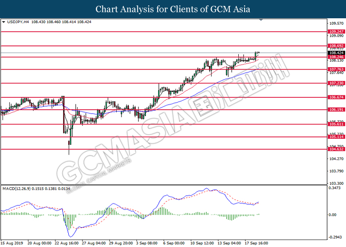 USDJPY, H4: USDJPY telah didagang dengan lebih tinggi selepas ia memecah tahap rintangan sebelumnya 108.25. MACD yang memaparkan momentum bullish mencadangkan pasangan ini untuk didagang dengan lebih tinggi ke arah tahap rintangan 108.70.