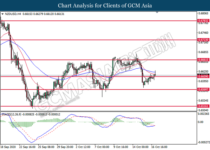 NZDUSD, H4: NZDUSD telah didagang dengan lebih tinggi selepas ia memecah tahap rintangan sebelumnya di 0.6610. MACD yang memaparkan isyarat bearish yang berkurangan mencadangkan pasangan ini untuk didagang dengan lebih tinggi dan menuju ke arah tahap rintangan di 0.6660.