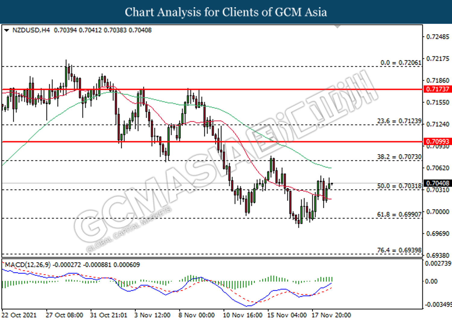 NZDUSD, H4: NZDUSD telah didagang dengan lebih tinggi selepas ia melantun dari paras bawahnya. MACD yang memaparkan isyarat bullish mencadangkan pasangan ini untuk didagang dengan lebih tinggi bagi jangka pendek.