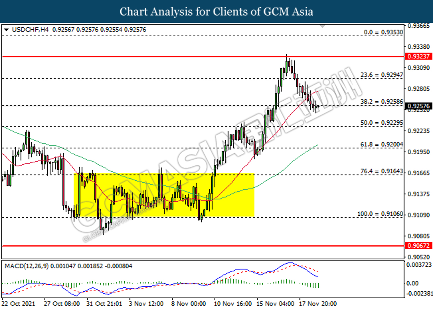 USDCHF, H4: USDCHF telah didagang dengan lebih rendah selepas ia berundur dari 0.9325. MACD yang memaparkan isyarat bearish mencadangkan pasangan ini untuk didagang dengan lebih rendah bagi jangka pendek.