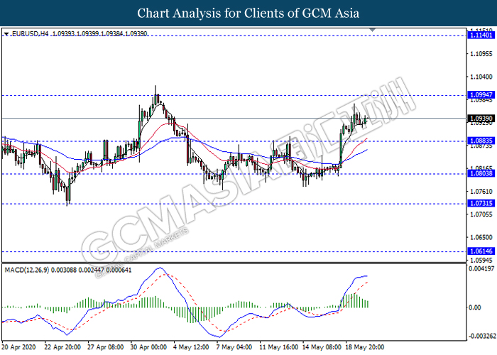 Pasangan Euro telah melonjak selepas data ekonomi yang positif dari rantau Eropah telah dibebaskan semalam. Menurut kepada ZEW, Jerman ZEW Economic Sentimen telah meningkat dengan mendadak dari bacaan terdahulu sebanyak 28.2 ke bacaan sebanyak 51.0, lebih baik daripada jangkaan pasaran iaitu 32.0, yang selanjutnya meningkatkan keyakinan pasaran terhadap perkembangan ekonomi di Eropah. Selain itu, euro melanjutkan keuntungannya susulan dengan cadangan rangsangan ekonomi dari Perancis dan Jerman untuk memerangi pemusnahan ekonomi yang akibat daripada wabak koronavirus. Menurut kepada Reuters, Perancis dan Jerman telah mengusulkan pada hari Isnin yang lalu bahawa rangsangan pemulihan ekonomi yang sebanyak 500 bilion euro untuk menyelesaikan masalah kecairan dan kesolvenan bagi wilayah dan sektor. Sekiranya rancangan tersebut telah disokong oleh negara-negara anggota, Suruhanjaya Eropah akan dapat mengumpulkan dana melalui pasaran awam. Tambahan pula, anggota Eropah dijangkakan akan mengemukakan cadangan mereka sebelum sidang kemuncak Eropah yang telah dijadualkan pada 27hb Mei 2020. Walau bagaimanapun, pada masa kini para pelabur perlu memantau perkembangan mengenai mesyuarat Menteri Kewangan EU pada hari ini untuk menerima isyarat dagangang yang lanjutnya. Semasa penulisan, EUR/USD telah meningkat sebanyak 0.16% ke 1.0939.