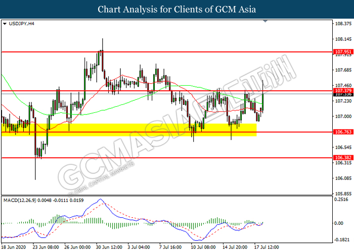 USDJPY, H4: USDJPY telah didagang dengan lebih tinggi sementara kini menguji di tahap rintangan 107.40. Namun, MACD yang memaparkan momentum bearish mencadangkan pasangan ini untuk mengalami pembetulan teknikal bagi jangka pendek.