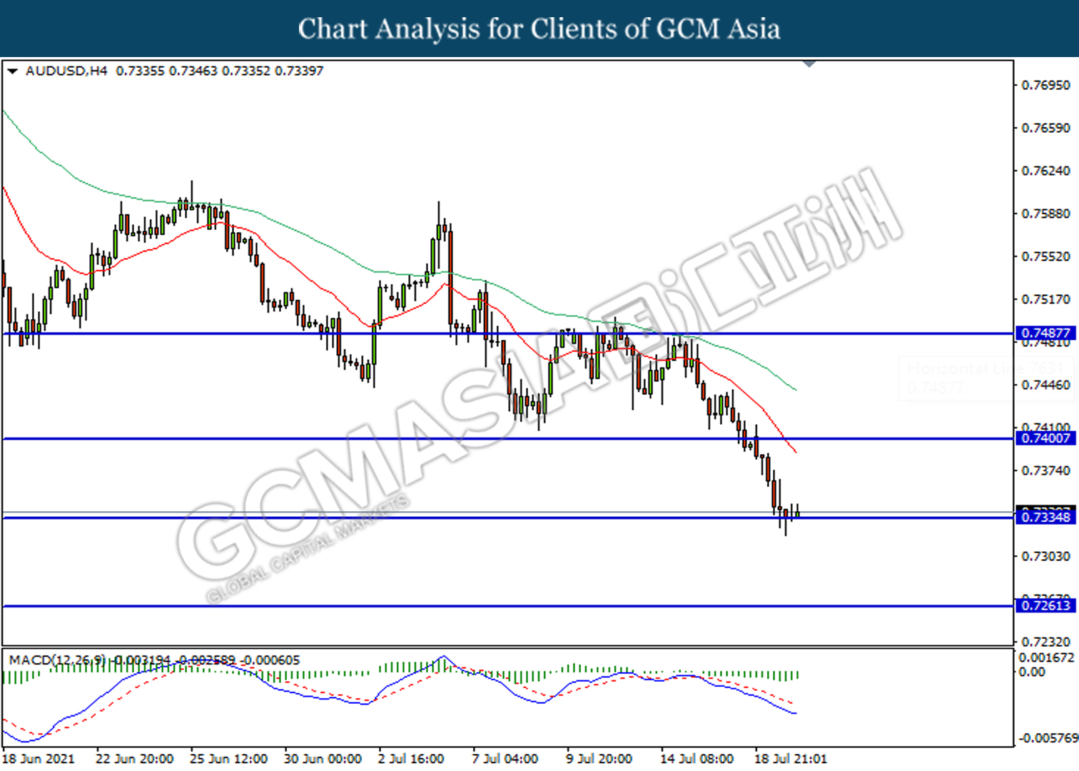 AUDUSD, H4: AUDUSD telah didagang dengan lebih rendah selepas ia berundur dari paras tingginya. MACD yang memaparkan isyarat bearish mencadangkan harganya untuk meneruskan kerugian selepas pemecahan berlaku di tahap sokongan tersebut.