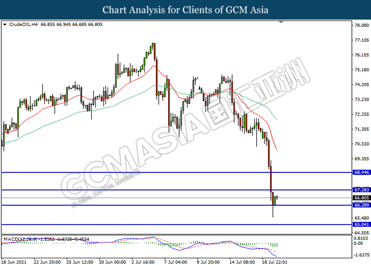CrudeOIL, H4: Harga minyak mentah telah didagang dengan lebih tinggi selepas ia melantun dari paras bawahnya. MACD yang memaparkan penyusutan pada momentum bearish mencadangkan harganya untuk meningkat bagi jangka pendek.