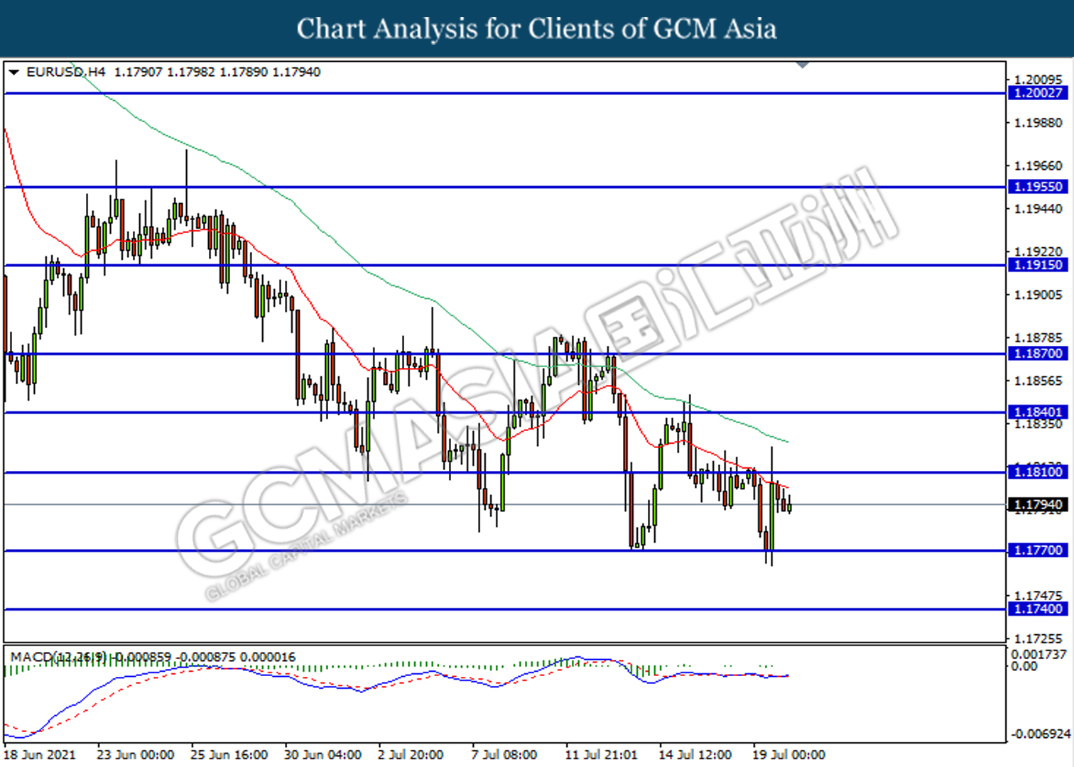 EURUSD, H4: EURUSD telah didagang dengan lebih rendah selepas ia berundur dari 1.1810. MACD yang memaparkan momentum menurun mencadangkan pasangan ini untuk didagang dengan lebih rendah bagi jangka pendek.