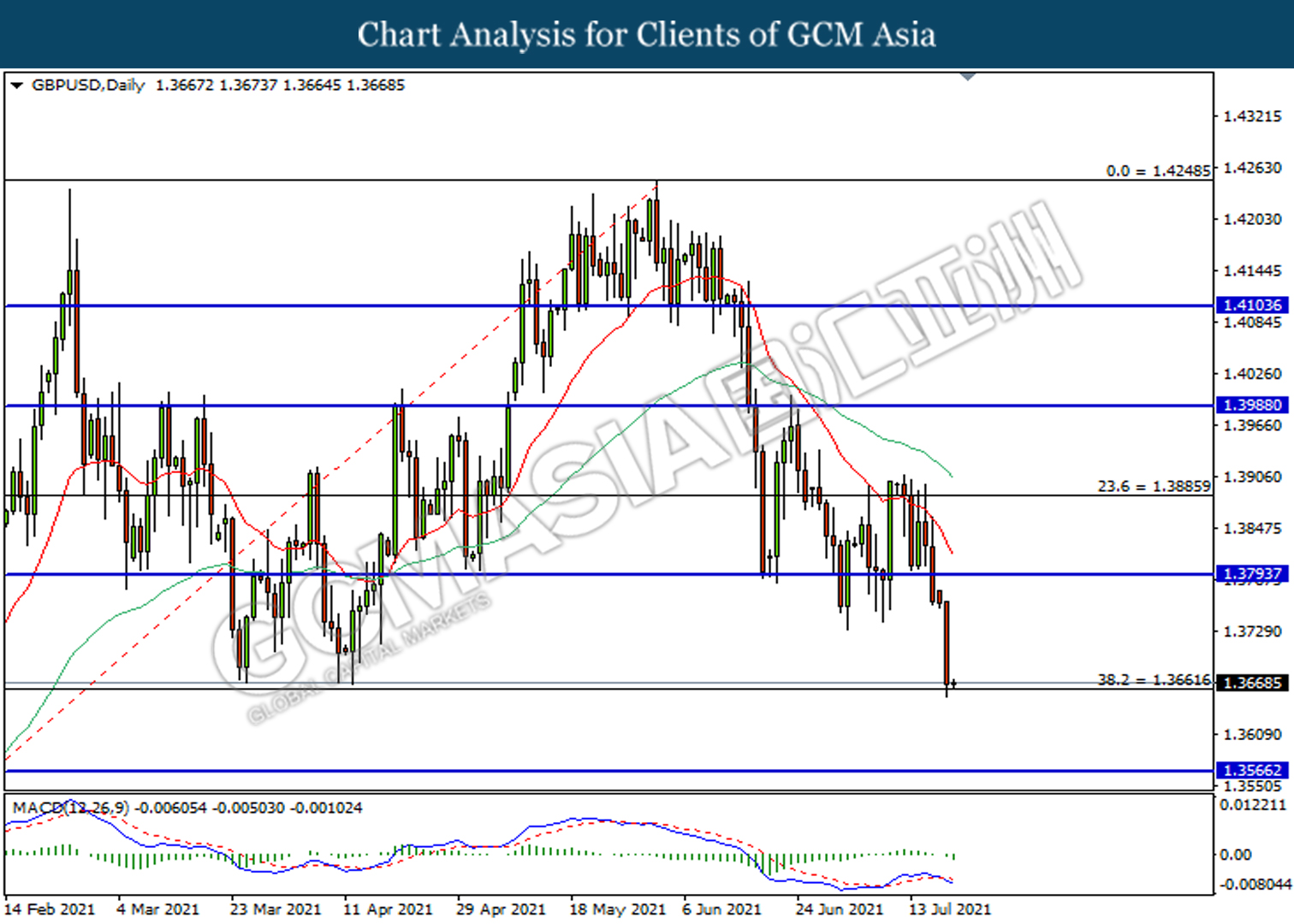 GBPUSD, Daily: GBPUSD telah didagang dengan lebih rendah selepas ia berundur dari paras atasnya. MACD yang memaparkan momentum bearish mencadangkan harganya untuk didagang dengan lebih rendah selepas pemecahan pada tahap sokongan tersebut.