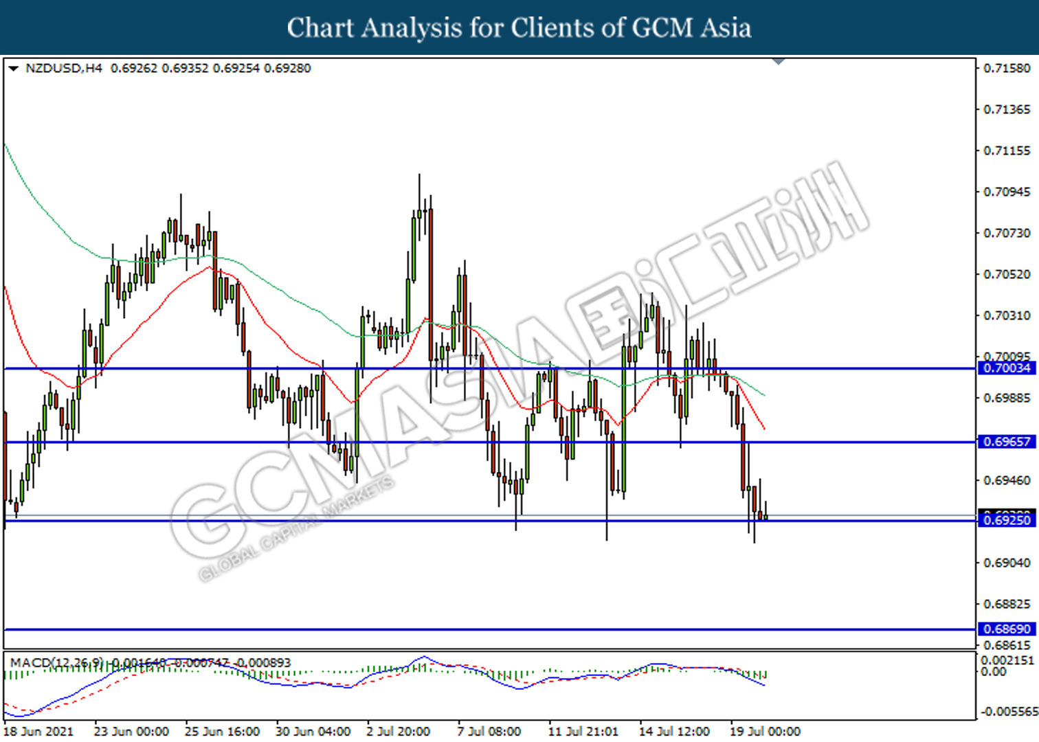 NZDUSD, H4: NZDUSD telah didagang dengan lebih rendah sementara kini menguji di tahap sokongan 0.6925. MACD yang memaparkan momentum menurun mencadangkan pasangan ini untuk meneruskan kerugiannya selepas pemecahan berlaku di tahap sokongan tersebut.