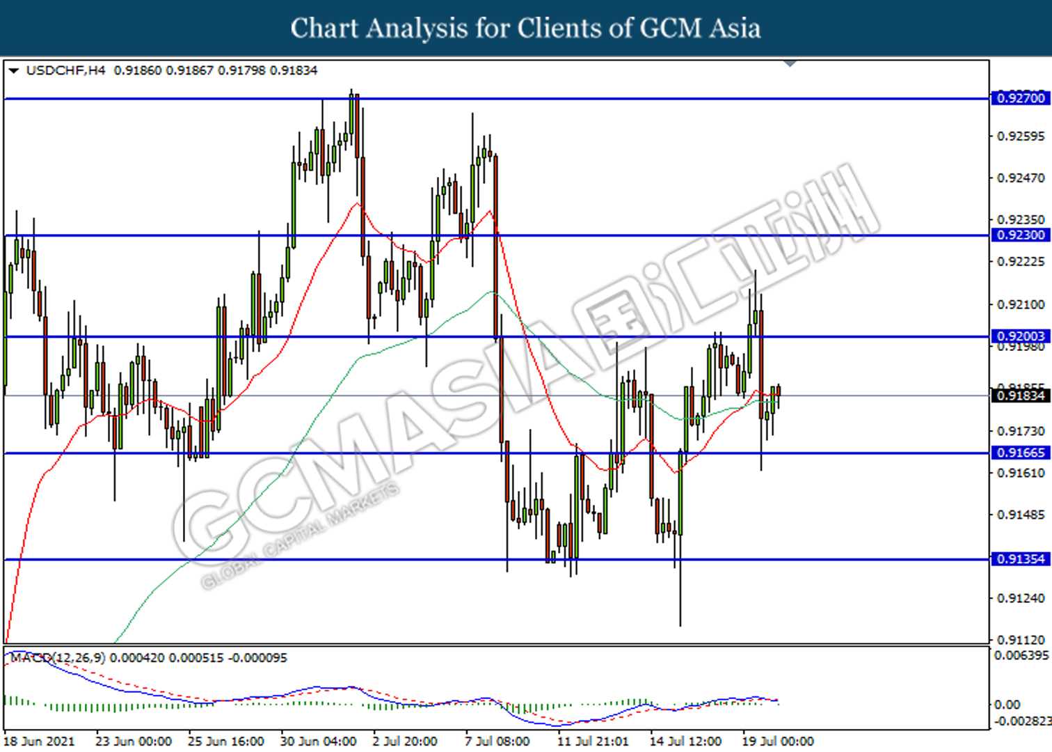 USDCHF, H4: USDCHF telah didagang dengan lebih tinggi selepas ia melantun dari 0.9165. MACD yang memaparkan momentum bullish mencadangkan pasangan ini untuk didagang dengan lebih tinggi bagi jangka pendek.