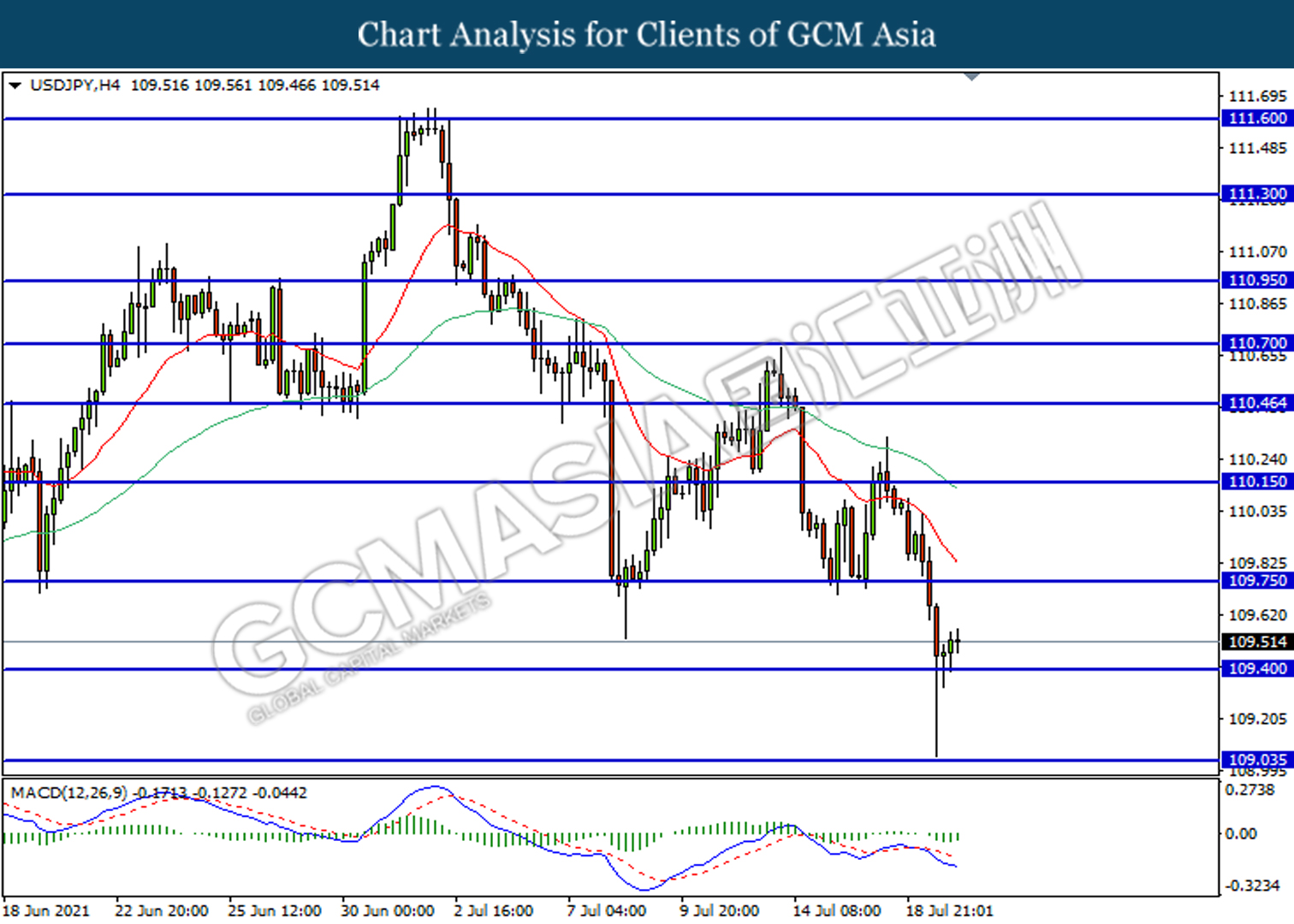 USDJPY, H4: USDJPY telah didagang dengan lebih tinggi selepas ia melantun dari paras bawahnya. MACD yang memaparkan penyusutan pada momentum menurun mencadangkan harganya untuk didagang dengan lebih tinggi bagi jangka pendek.