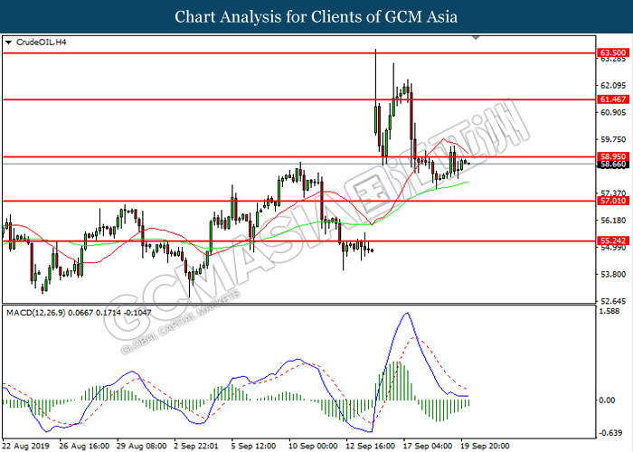 CrudeOIL, H4: Harga minyak mentah telah didagang dengan lebih tinggi sementara ia menguji berhampiran dengan tahap rintangan 58.95. MACD yang memaparkan bearish momentum yang berkurangan mencadangkan pasangan ini untuk meneruskan keuntungannya selepas ia memecahkan tahap rintangan tersebut.
