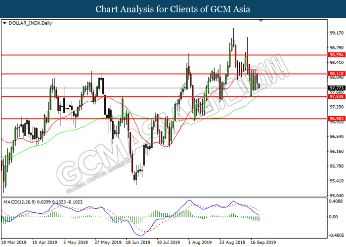 DOLLAR_INDX, Daily: Indeks dolar telah didagang dengan lebih rendah berikutan dengan pengunduran dari tahap rintangan 98.10. MACD yang memaparkan momentum bearish mencadangkan pasangan ini untuk meneruskan kerugiannya ke tahap sokongan 97.55.
