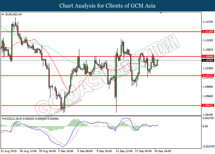 EURUSD, H4: EURUSD telah didagang dengan lebih tinggi selepas ia melantun dari 20 MA line. MACD yang memaparkan momentum bullish mencadangkan pasangan ini untuk melanjutkan keuntungannya ke arah tahap rintangan 1.1065.