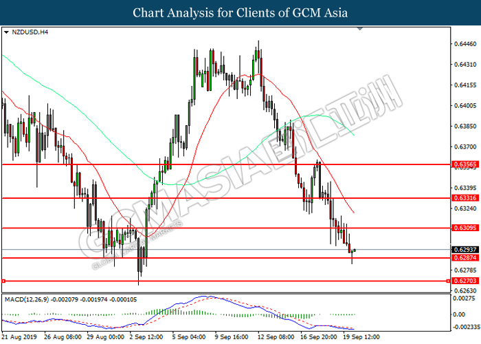 NZDUSD, H4: NZDUSD telah didagang dengan lebih tinggi selepas ia melantun dari tahap sokongan 0.6290. MACD yang memaparkan momentum bearish yang berkurangan mencadangkan pasangan ini untuk melanjutkan keuntungannya ke tahap rintangan 0.6310.