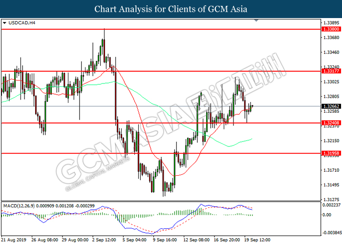 USDCAD, H4: USDCAD telah didagang dengan lebih tinggi selepas ia melantun dari tahap sokongan 1.3240. MACD yang memaparkan momentum bearish yang berkurangan mencadangkan pasangan ini untuk melanjutkan keuntungannya ke arah tahap rintangan 1.3320.