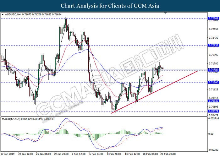 AUDUSD, H4: AUDUSD telah didagang dengan lebih rendah sementara menguji pada tahap sokongan di 0.7160. MACD yang memaparkan isyarat bias bearish mencadangkan pasangan ini untuk melanjutkan momentum bearishnya selepas ia berjaya untuk memecahkan pada tahap sokongan tersebut.