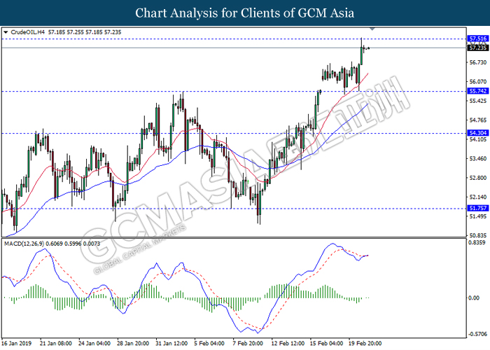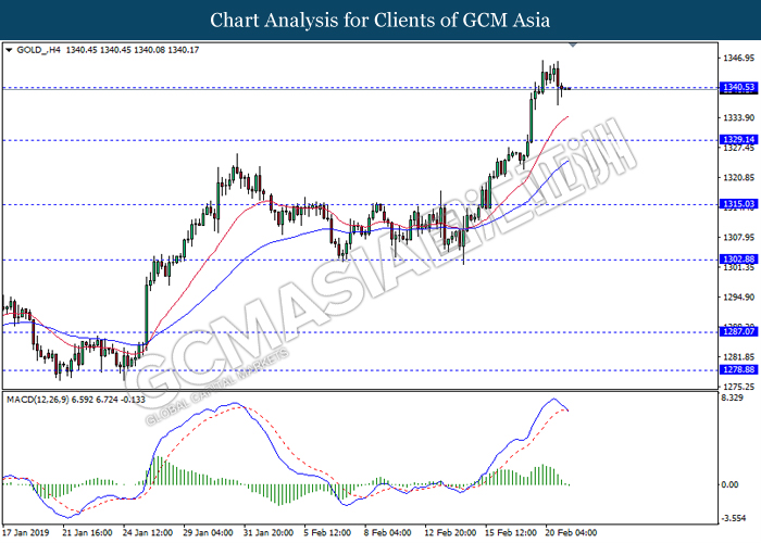 Dalam pasaran komoditi, harga minyak mentah telah menjunam sebanyak 0.82% ke $57.20 setong selepas mencecah paras tertinggi dalam tahun 2019. Penurunan harga minyak adalah disebabkan oleh peningkatan inventori dalam AS yang dilaporkan oleh American Petroleum Institute (API). Namun, sentimen terkini bagi pasaran minyak berkekal bullish sewaktu ketegangan perdagangan menyusut daripada pasaran di mana para pelabur menjangkakan AS dan China untuk mencapai perjanjian. Di samping itu, harga minyak mentah turut didorong oleh pemotongan bekalan OPEC dan juga sekatan ke atas minyak Iran dan Venezuela. Sebaliknya, harga emas telah menaik sebanyak 0.15% ke $1340.45 di tengah-tengah isu politik UK dan juga kenyataan FOMC yang dovish.