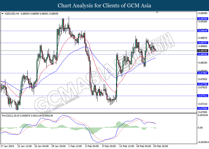 NZDUSD, H4: NZDUSD telah didagang dengan lebih rendah susulan dengan pengunduran dari tahap rintangan di 0.6875. MACD yang memaparkan momentum bearish dengan formasi silang kematian mencadangkan pasangan ini untuk melanjutkan pengundurannya ke arah tahap sokongan di 0.6845.