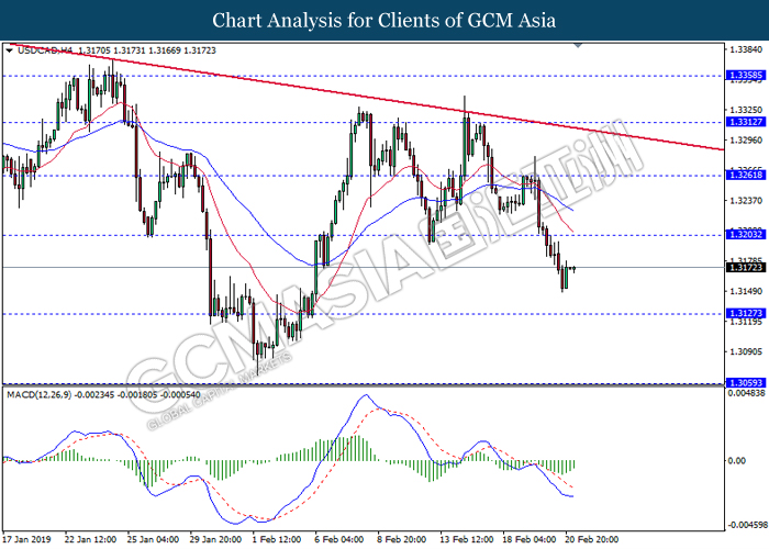 USDCAD, H4: USDCAD telah didagang dengan lebih tinggi berikutan dengan lantunan dari paras rendah. MACD yang menunjukkan momentum bearish yang berkurangan mencadangkan pasangan ini untuk melanjutkan lantunannya ke arah tahap rintangan di 1.3205.
