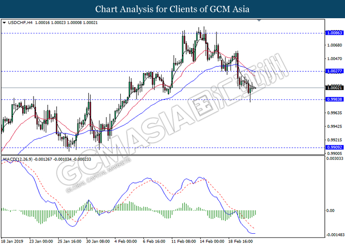 USDCHF, H4: USDCHF telah didagang dengan lebih tinggi susulan dengan lantunan dari tahap sokongan di 0.9985. MACD yang memaparkan isyarat bias bullish mencadangkan pasangan ini untuk melanjutkan lantunannya ke arah tahap rintangan di 1.0025.