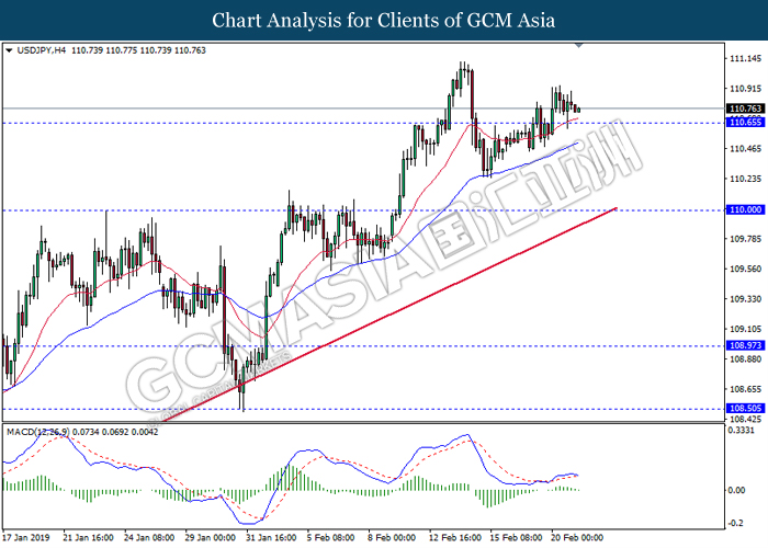 USDJPY, H4: USDJPY telah didagang dengan rata berikutan dengan pengunduran dari paras tinggi. MACD yang memaparkan momentum bullish yang berkurangan mencadangkan pasangan ini untuk melanjutkan pengundurannya ke arah tahap sokongan di 110.65.