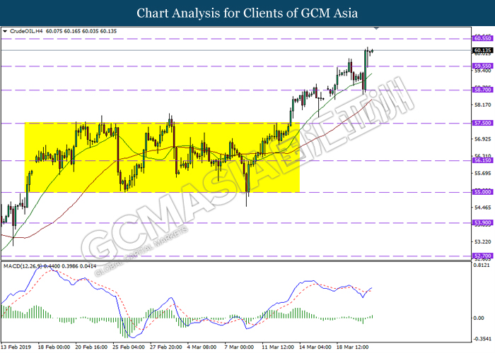 CrudeOIL, H4: Harga minyak mentah telah didagang dengan lebih tinggi susulan dengan pemecahan dari tahap rintangan sebelumnya di 59.55. MACD yang memaparkan momentum bullish dengan formasi silang emas mencadangkan komoditi ini untuk melanjutkan keuntungannya ke arah tahap rintangan di 60.55.