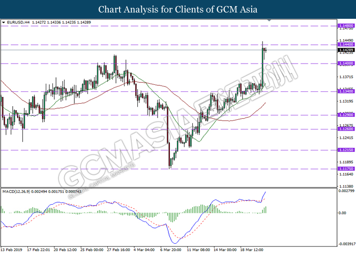 EURUSD, H4: EURUSD telah didagang dengan lebih tinggi sementara menguji berdekatan tahap rintangan di 1.1440. MACD yang memaparkan momentum bullish mencadangkan pasangan ini untuk melanjutkan keuntungannya selepas ia berjaya untuk memecahkan pada tahap rintangan tersebut.