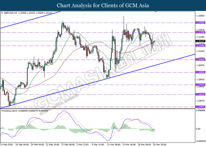 GBPUSD, H4: GBPUSD telah didagang dengan lebih tinggi berikutan dengan lantunan dari tahap sokongan di 1.3280. MACD yang memaparkan isyarat bias bullish mencadangkan pasangan ini untuk melanjutkan lantunannya ke arah tahap rintangan di 1.3270.