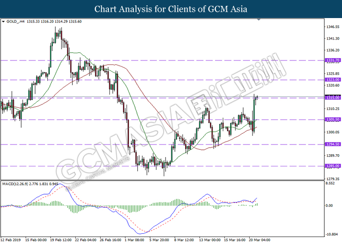 Bagi pasaran komoditi, harga minyak mentah telah meningkat sebanyak 0.10% ke $60.10 setong serta mencecah paras tertinggi dalam 4 bulan susulan dengan berita yang positif yang telah mendorong kepada peningkatan permintaan bagi minyak. Menurut kepada data terkini, US Energy Information Administration telah mencatatkan penurunan secara mendadak dalam tahap inventori ke paras -9.6 juta tong pada minggu lepas berbanding dengan ramalan ekonomis sebanyak 309,000 tong. Penurunan tersebut adalah yang terbesar sejak Julai 2018 dan tahap yang terendah sejak bulan Januari. Sebaliknya, harga emas telah meningkat sebanyak 0.25% ke $1315.85 se troy auns semasa penulisan berikutan dengan keputusan yang tidak dijangka dari Fed yang menyebabkan para pelabur untuk meninggalkan pasaran dolar dan memasuki ke dalam pasaran aset selamat.