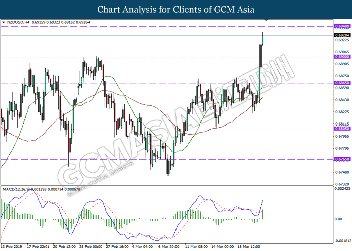 NZDUSD, H4: NZDUSD telah didagang dengan lebih tinggi susulan dengan pemecahan dari tahap rintangan sebelumnya di 0.6900. MACD yang menunjukkan isyarat bullish yang berterusan mencadangkan pasangan ini untuk melanjutkan keuntungannya ke arah tahap rintangan di 0.6940.