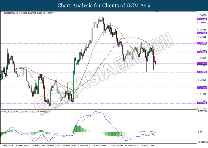 USDCAD, H4: USDCAD telah didagang dengan lebih rendah sementara menguji berdekatan tahap sokongan di 1.3280. MACD yang menunjukkan momentum bearish dengan formasi silang kematian mencadangkan pasangan ini untuk melanjutkan kerugiannya selepas ia berjaya untuk menutupkan lilinnya di bawah tahap sokongan tersebut.