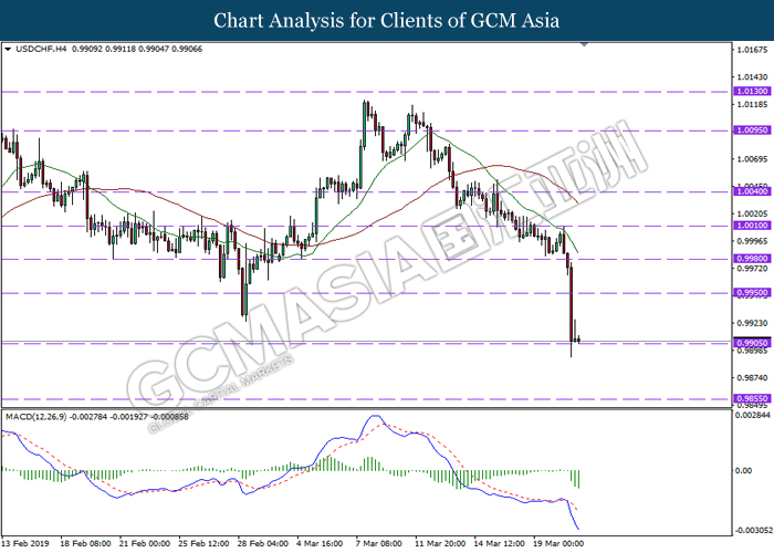 USDCHF, H4: USDCHF telah didagang dengan lebih rendah sementara menguji berdekatan tahap sokongan di 0.9905. MACD yang memaparkan momentum bearish mencadangkan pasangan ini untuk melanjutkan kerugiannya selepas ia berjaya untuk memecahkan pada tahap sokongan tersebut.