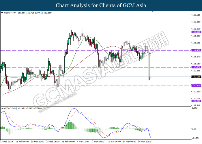 USDJPY, H4: USDJPY telah didagang dengan lebih rendah berikutan dengan pemecahan dari tahap sokongan sebelumnya di 110.95. MACD yang menunjukkan isyarat bearish mencadangkan pasangan ini untuk melanjutkan kerugiannya ke arah tahap sokongan di 110.40.
