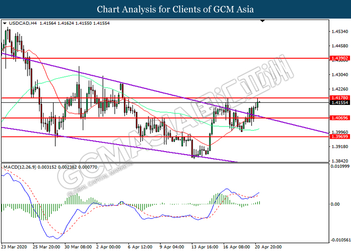USDCAD, H4: USDCAD telah didagang dengan lebih tinggi sementara kini menguji di tahap rintangan 1.4180. MACD yang memaparkan momentum bullish mencadangkan pasangan ini untuk melanjutkan keuntungannya selepas ia memecah tahap rintangan tersebut.