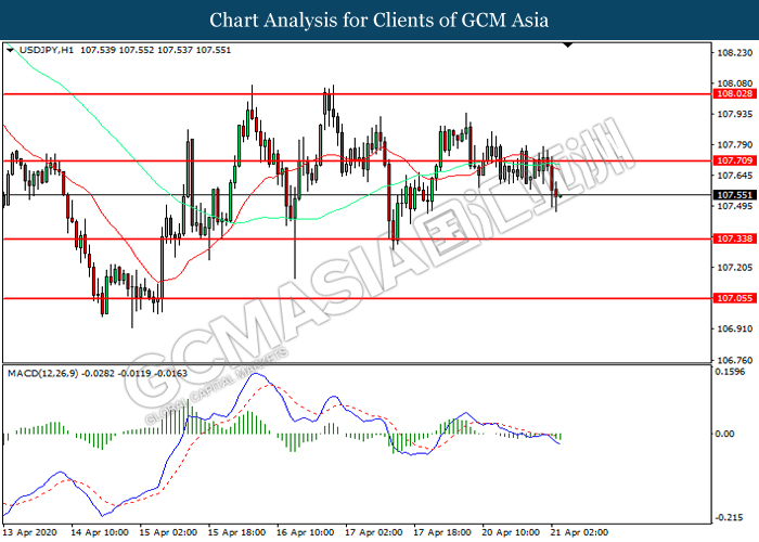 USDJPY, H1: USDJPY telah didagang dengan lebih rendah selepas ia berundur dari tahap rintangan 107.70. MACD yang memaparkan momentum bearish mencadangkan pasangan ini untuk melanjutkan kerugiannya ke arah tahap sokongan 107.35.