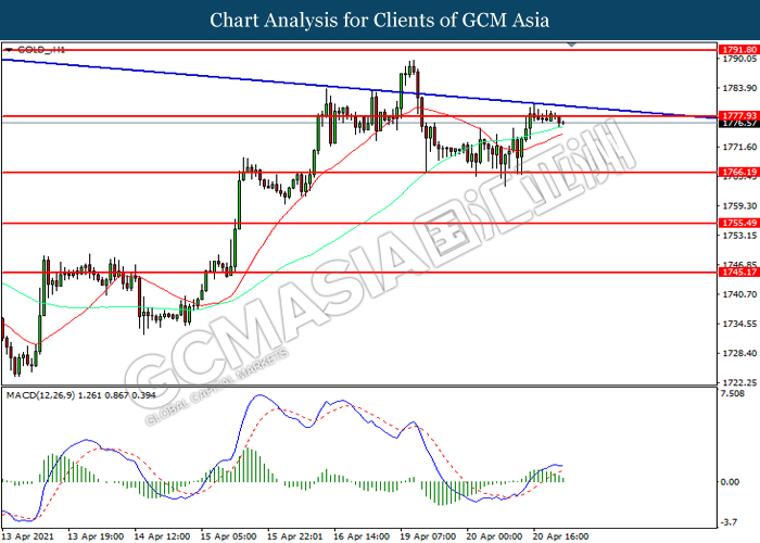 GOLD_, H1: Harga emas telah didagang dengan lebih tinggi sementara kini menguji di tahap rintangan 1777.95. Namun, MACD yang memaparkan momentum bullish yang berkurangan mencadangkan komoditi ini untuk mengalami pembetulan teknikal bagi jangka pendek.