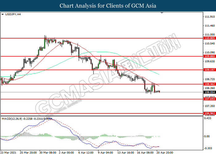 USDJPY, H4: USDJPY telah didagang dengan lebih rendah selepas ia memecah tahap sokongan terdahulu 108.45. MACD yang memaparkan momentum bearish mencadangkan pasangan ini untuk melanjutkan kerugiannya ke arah tahap sokongan 107.70.