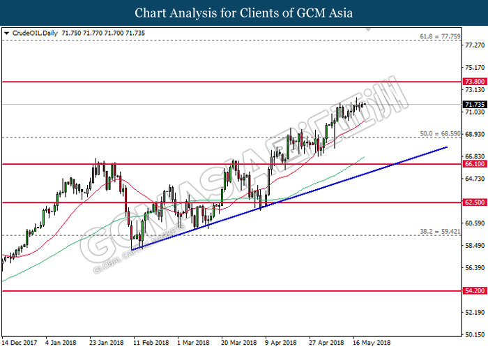 Seawalnya, harga minyak menerima momentum bullish selepas AS menarik diri dari perjanjian nuklear dengan negara Iran. Pengumuman tersebut yang telah dibuat pada dua minggu yang lalu meningkatkan spekulasi ke atas sekatan yang baru dilaksanakan ke atas negara pengeluar minyak tersebut yang boleh mengurangkan tekanan ke atas kelebihan stok global. Namun, impak sekatan tersebut adalah masih tidak ketahui oleh kerana zon Eropah dan China enggan untuk bersetuju dengan tindakan AS.