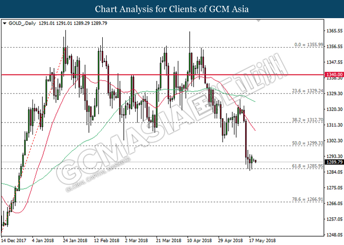 GOLD_, Daily: Harga emas telah didagang dengan lebih rendah selepas ia menutup niaga di bawah tahap sokongan di 1300.00. Kedua-dua garisan MA yang masih melebar ke bawah mencadangkan harga komoditi ini untuk meneruskan kerugiannya selepas ia memecahkan tahap sokongan di 1285.95.