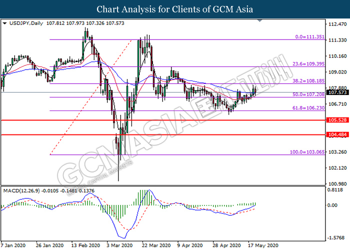 USDJPY, Daily: USDJPY telah didagang dengan lebih tinggi selepas ia memecah tahap rintangan sebelumnya di 107.20. MACD yang menunjukkan isyarat momentum bullish yang berterusan mencadangkan pasangan ini untuk melanjutkan keuntungannya dan menuju ke arah tahap rintangan di 108.20.