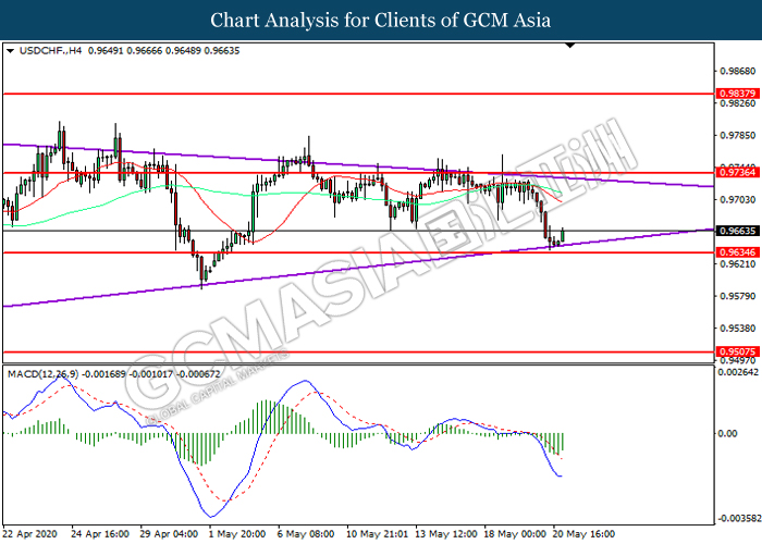 USDCHF, H4: USDCHF telah didagang dengan lebih tinggi selepas ia melantun dari tahap sokongan 0.9635. MACD yang memaparkan momentum bearish yang berkurangan mencadangkan pasangan ini untuk melanjutkan keuntungannya ke arah tahap rintangan 0.9735.