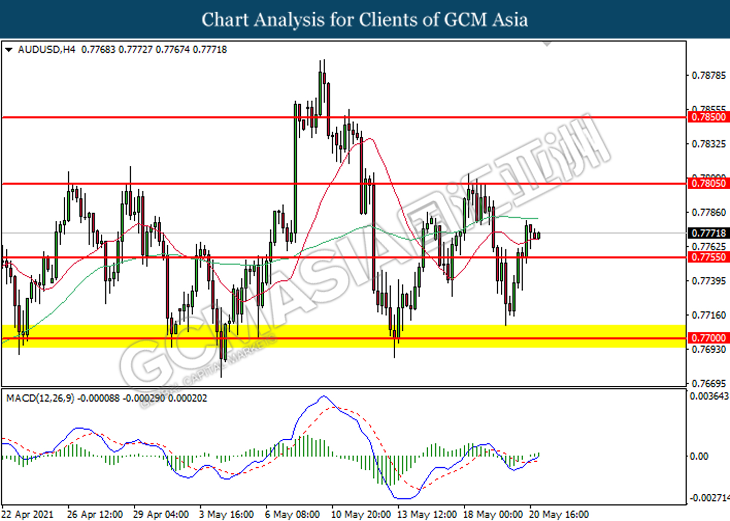 AUDUSD, H4: AUDUSD telah didagang dengan lebih tinggi selepas ia melantun dari paras bawahnya. MACD yang memaparkan isyarat bullish mencadangkan harganya untuk didagang dengan lebih tinggi bagi jangka pendek.