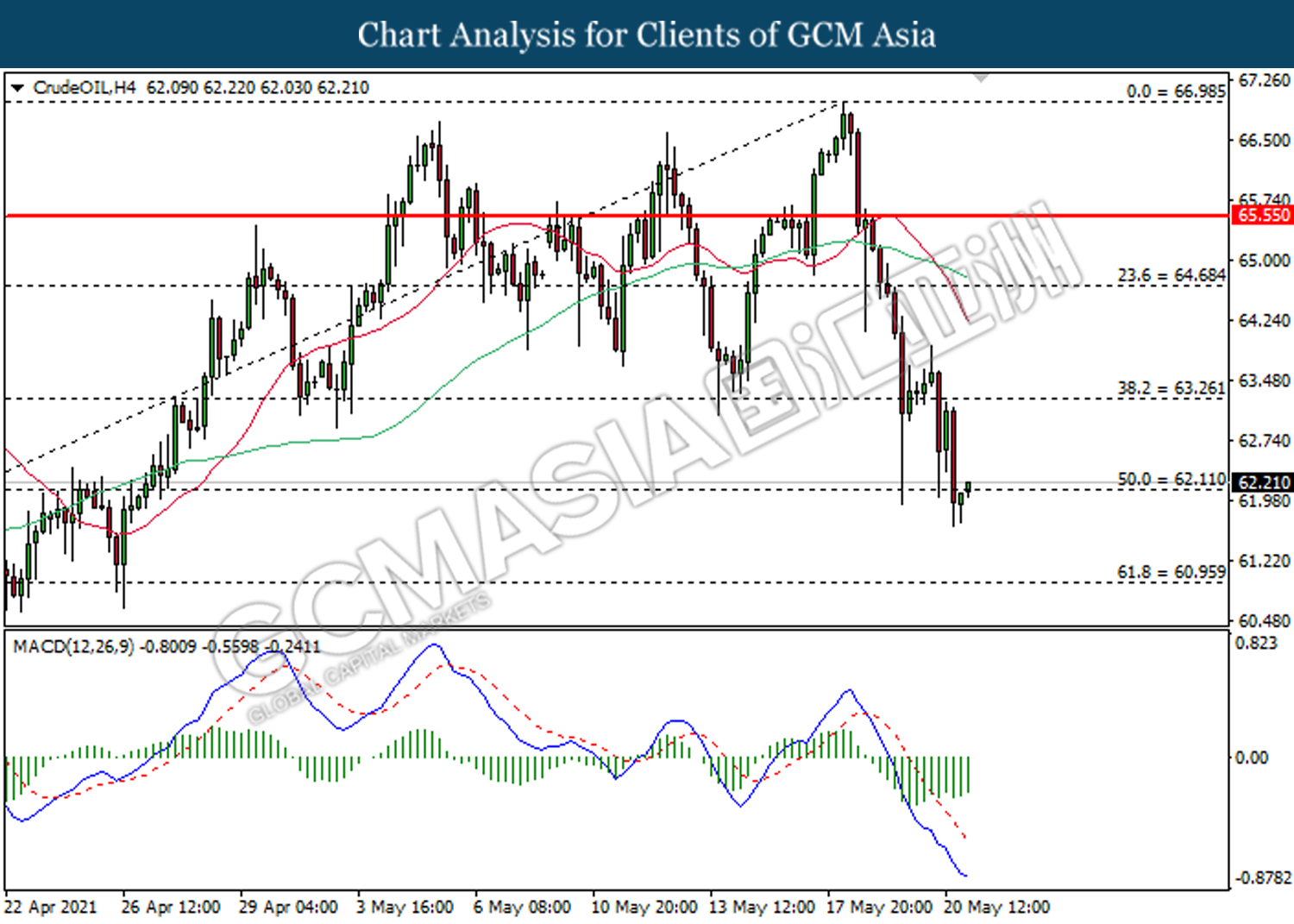 Bagi pasaran komoditi, harga minyak mentah menjunam lebih daripada 5% pada semalam ke $61.98 setong. Menurut kepada SCMP, Israel dan Gaza telah bersetuju ke atas gencatan sejata mulai 2AM hari ini. Tindakan tersebut telah menurunkan senario gangguan pembekalan minyak dari rantau tersebut. Sementara itu, harga emas menurun sebanyak 0.06% ke $1,875.84 se troy auns berikutan dengan penyusutan ketegangan diantara Israel dan Gaza.
