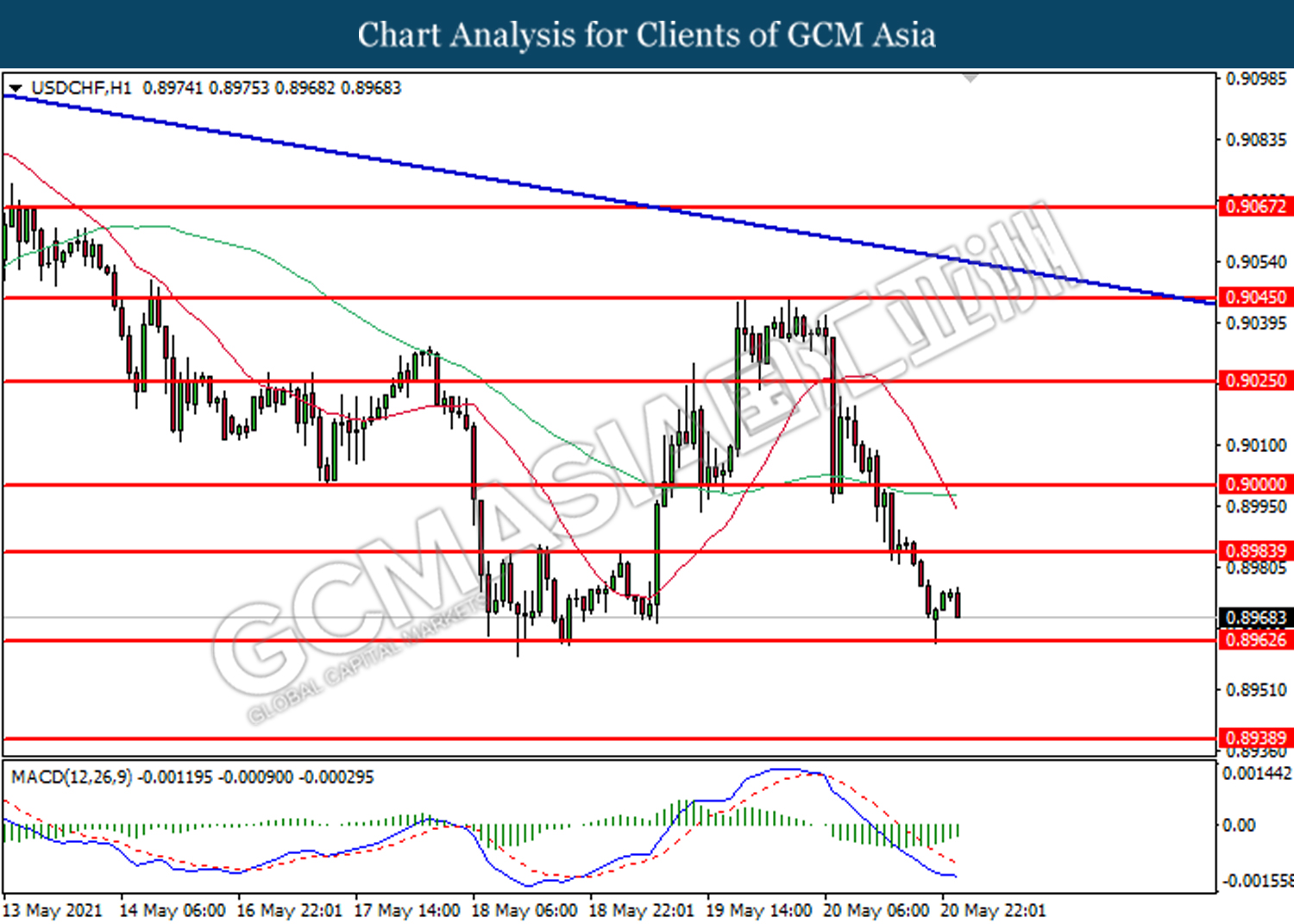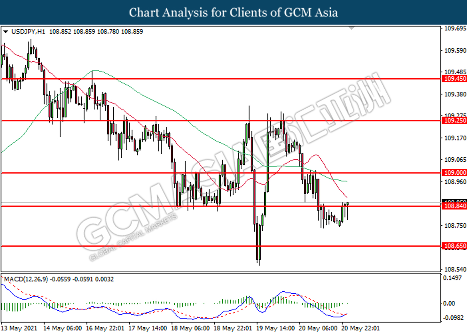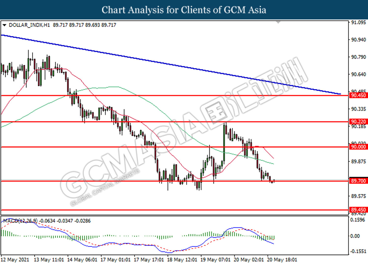 Dolar AS telah berundur dari paras tingginya selepas para pelabur mencerna isyarat mengenai pengetatan dasar kewangan dari minit mesyuarat FOMC. Semasa penulisan, indeks dolar menurun sebanyak 0.02% ke 89.89 semasa sesi dagangan Asia. Di dalam minit mesyuarat, beberapa ahli Fed mencadangkan untuk membincang mengenai penurunan jumlah program pembelian bon sekiranya pemulihan ekonomi di AS makin bertambah rancak. Namun, para pelabur mendapati bahawa ia bakal mengambil masa yang lebih panjang memandangkan data ekonomi baru-baru ini memaparkan penyusutan dari segi momentum pemulihan. Bagi bulan Mei, Philadelphia Fed Manufacturing Index menjunam dari 50.2 ke 31.5, lebih rendah daripada ramalan iaitu 43.0. Penyusutan pada aktiviti sektor pembuatan telah didorong oleh kesukaran untuk mengambil pekerja selepas Philadelphia meningkatkan tempoh masa pekerjaan. Selain itu, kekurangan bahan mentah akibat daripada pandemik koronavirus juga telah mendorong kepada penyusutan aktiviti sektor pembuatan.