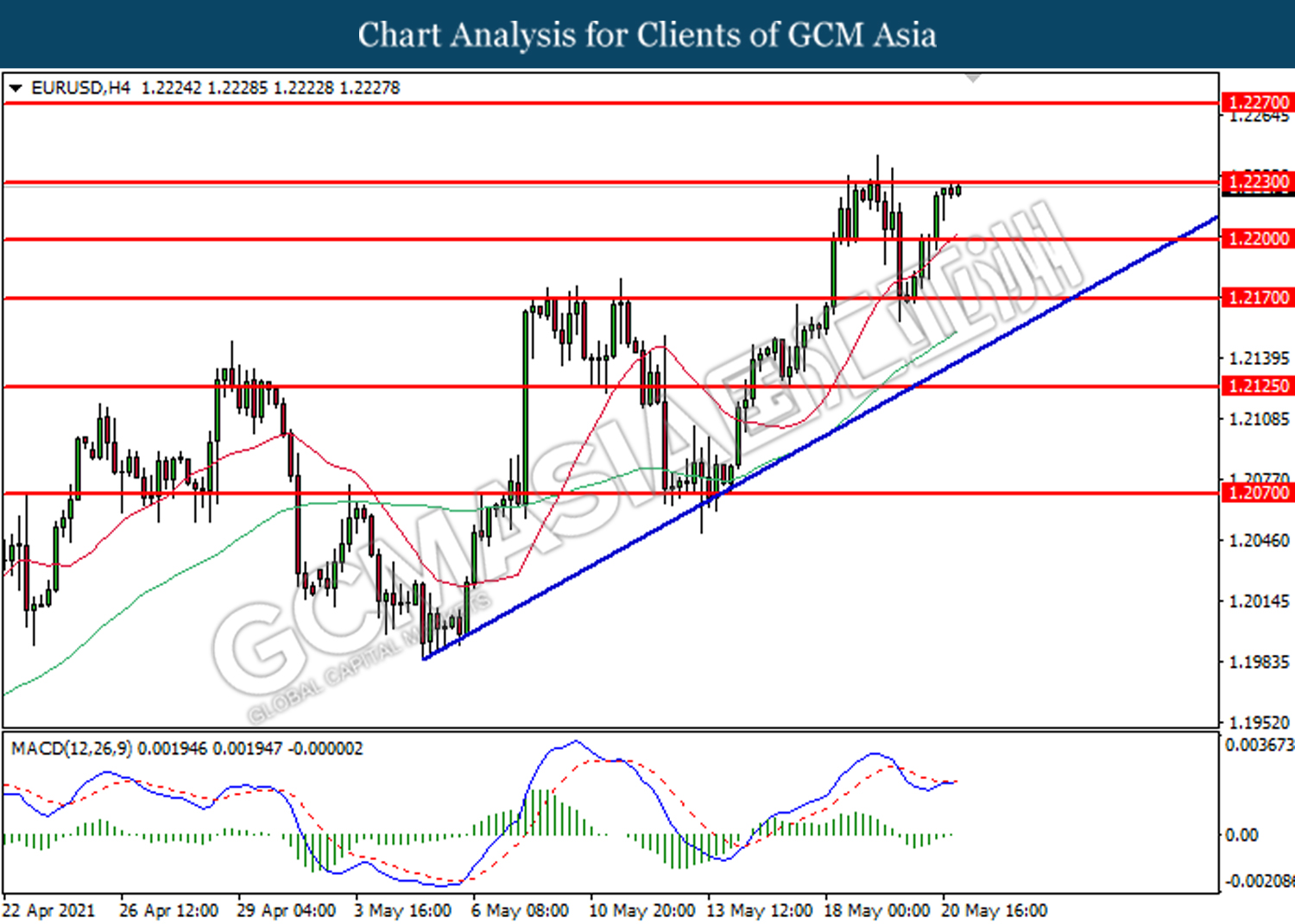 EURUSD, H4: EURUSD telah didagang dengan lebih tinggi selepas ia melantun dari paras bawahnya. MACD yang memaparkan isyarat bullish mencadangkan harganya untuk didagang dengan lebih tinggi bagi jangka pendek.