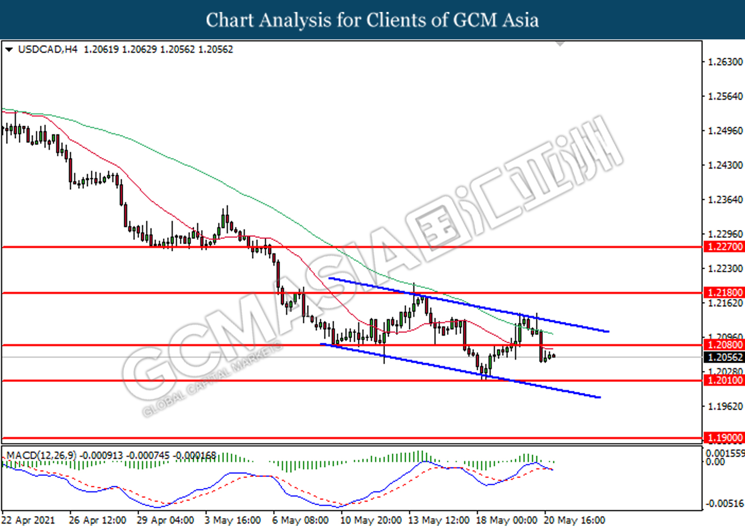 USDCAD, H4: USDCAD telah didagang dengan lebih rendah selepas ia berundur dari paras atasnya. MACD yang memaparkan isyarat bearish mencadangkan pasangan ini untuk didagang dengan lebih rendah bagi jangka pendek.