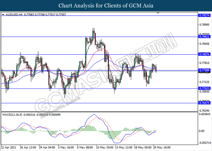 AUDUSD, H4: AUDUSD telah didagang dengan lebih rendah sementara ia sedang menguji tahap sokongan 0.7760. MACD yang memaparkan isyarat bias bearish mencadangkan pasangan ini untuk melanjutkan kerugiannya selepas ia memecah tahap sokongan tersebut.