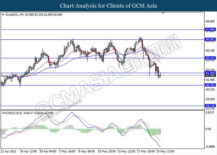 CrudeOIL, H4: Harga minyak mentah telah didagang dengan lebih rendah susulan dengan pemecahan pada tahap sokongan sebelumnya 62.35. MACD yang memaparkan isyarat momentum bearish mencadangkan komoditi ini untuk melanjutkan kerugiannya ke arah tahap sokongan 60.75.